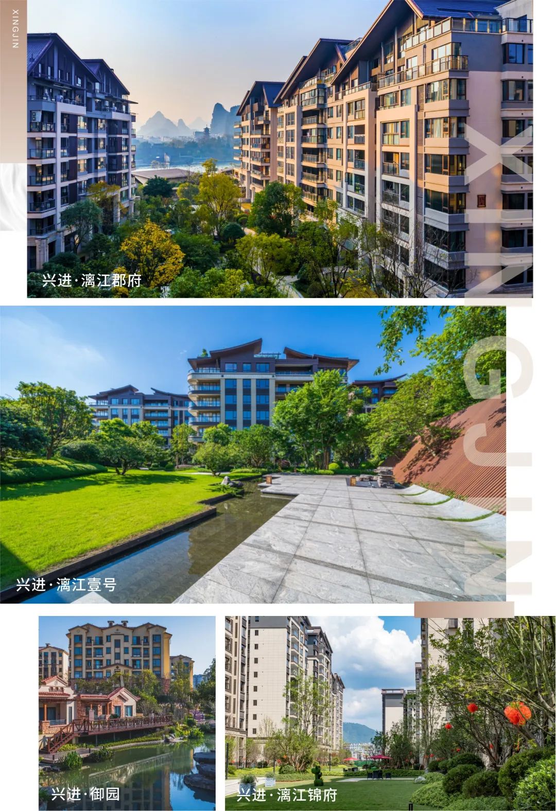 交付项目包括兴进·御园、兴进·漓江郡府、兴进·漓江壹号、兴进·景园(阳朔)、兴进·漓江锦府、繁花里,在广西本土房企中名列前茅。